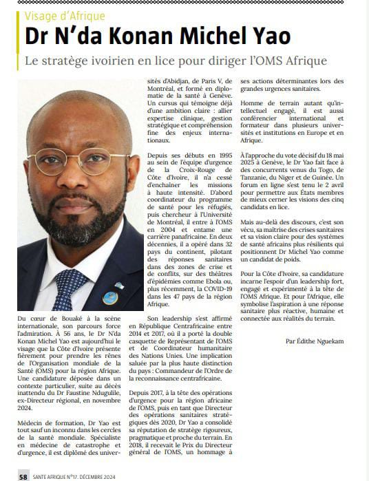 Visage D'Afrique Dr N'da Konan Michel Yao. Le stratég Ivoirien en lice pour diriger l'OMS Afrique Afrique Santé N°18 Mars Avril 2025 Lire l'article